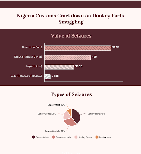 In the last four months, there have been several major arrests across the country. On October 15, 2025, the Adamawa/Taraba Area Command of the Nigerian Customs Service announced that its operatives intercepted 64 complete donkey skins, valued at N112.59 million, being smuggled to China through the Republic of Cameroon. In July 2025, the Nigeria Customs Service intercepted a container-load of 10,603 male donkey genitals along the Kaduna-Abuja Expressway. In June, the Nigerian Customs Service, Federal Operations Unit, FOU Zone C, Owerri, intercepted 13.6kg of dry donkey skin worth N3.6 billion in Owerri, Imo State.